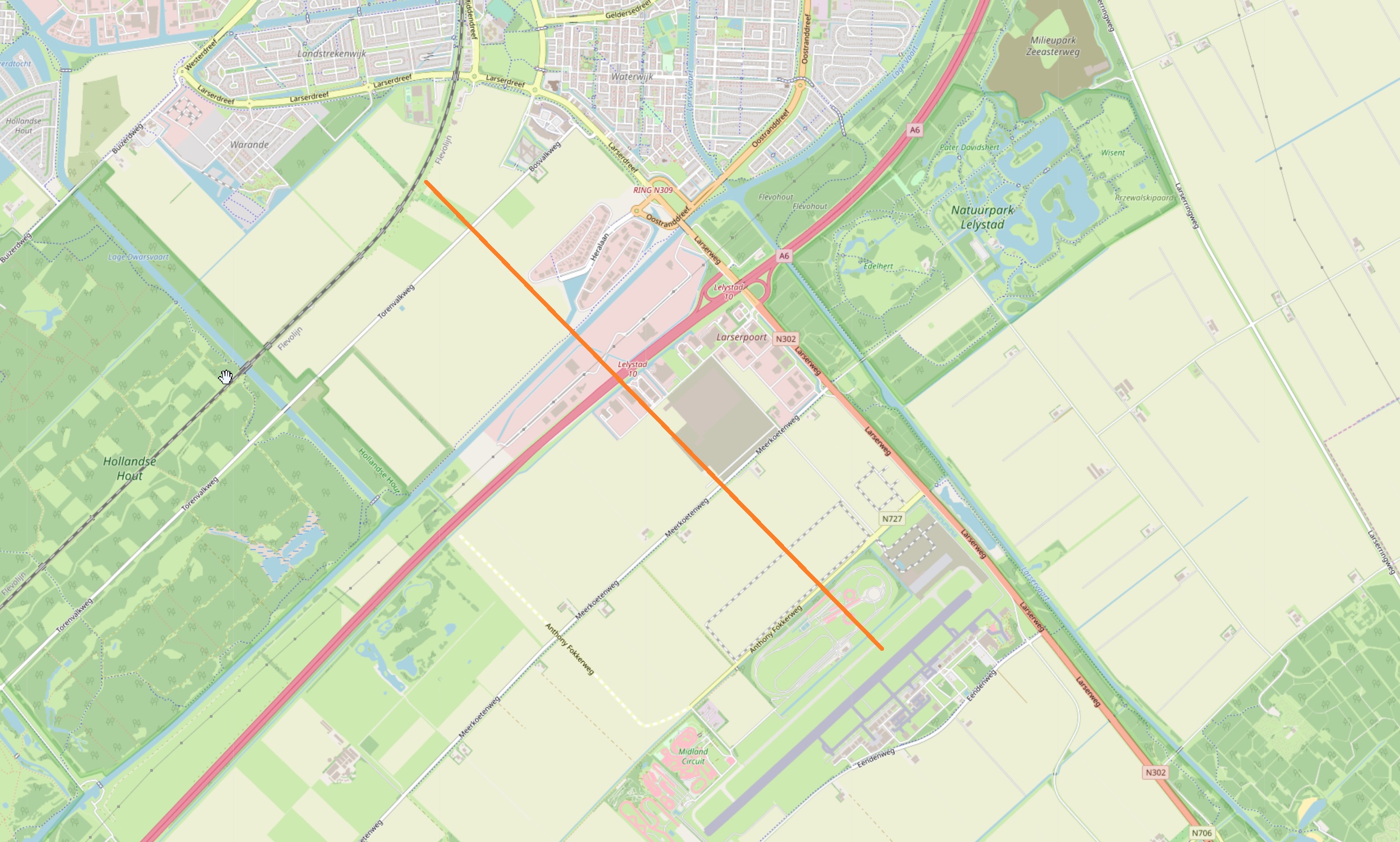 Het plan is om een aftakking aan te leggen vanaf de spoorweg die loopt tussen Almere en Lelystad (Flevolijn). Zie onderstaande afbeelding.